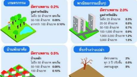 รู้สักนิดกับอัตราภาษีที่ดินฉบับใหม่ ไม่ทราบว่าท่านเจ้าของที่ดินทั้งหลายทราบหรือไม่ว่า ได้มี พ.ร.บ. ภาษีที่ดินและสิ่งปลูกสร้างฉบับใหม่ ประกาศลงในราชกิจจานุเบกษาแล้ว โดยได้กำหนดอัตราภาษีที่ดินฉบับใหม่ขึ้น ทั้งนี้อัตราภาษีใหม่ทั้งหมดจะเริ่มใช้ในปี 2563 เป็นต้นไป การกำหนดอัตราภาษีที่ดินและสิ่งปลูกสร้างขึ้นใหม่ โดยตาม พ.ร.บ. ฉบับนี้ ได้แบ่งที่ดินออกเป็น 4 ประเภท โดยที่ดินแต่ละประเภทจะถูกเก็บภาษีในอัตราต่างกัน คือ ที่ดินเพื่อการเกษตรกรรม จะถูกเก็บภาษีในอัตราต่ำที่สุด นั่นคือไม่เกินปีละ 15% ของมูลค่าที่ดิน นอกจากนี้ยังได้รับการลดหย่อนในช่วง 2 ปีแรก ให้จ่ายภาษีในอัตราปีละ 0.01-0.1% ของมูลค่า ที่ดินเพื่อการอยู่อาศัย จะถูกเก็บภาษีในอัตราปีละไม่เกิน 3% ของมูลค่าที่ดินและสิ่งปลูกสร้าง โดยในช่วง 2 ปีแรกจะได้รับการลดหย่อนภาษี โดยอัตราภาษีจะอยู่ในช่วง 0.02%-0.1% ต่อปีในช่วง 2 ปีแรก อย่างไรก็ตาม หากราคาที่ดินและบ้านไม่เกิน 50 ล้านบาท จะได้รับการยกเว้นไม่ต้องเสียภาษี ที่ดินที่ถูกนำไปใช้ประโยชน์อื่นๆ นอกเหนือจากการเกษตรกรรมหรืออยู่อาศัย ต้องเสียภาษีที่ดินไม่เกินปีละ 2% ของมูลค่าที่ดิน โดยในช่วง 2 ปีแรกจะได้รับการลดหย่อนอัตราภาษี